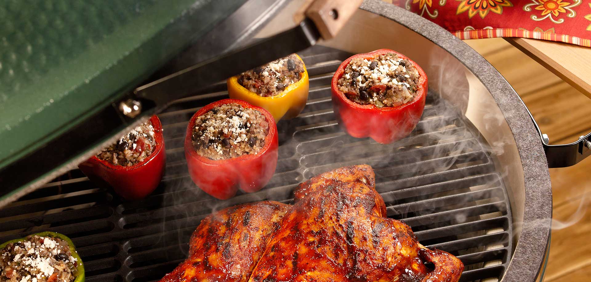 At Main Course Cooking School, we do our outdoor cooking on The Big Green Egg, a "must have" piece of culinary equipment for the avid grilling aficionado. The Egg is a smoker, a grill and an oven. You can cook literally any food on it year around, from appetizers to entrees to desserts.